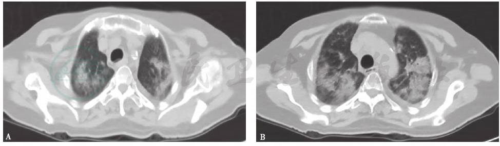 胸部X线检查可见双肺弥漫高密度影,双侧少量胸腔积液(图4),1个月后病灶进一步增多、加重(图5)。胸部CT显示病灶进一步融合增多,伴双侧胸腔积液和心包积液(图6)。