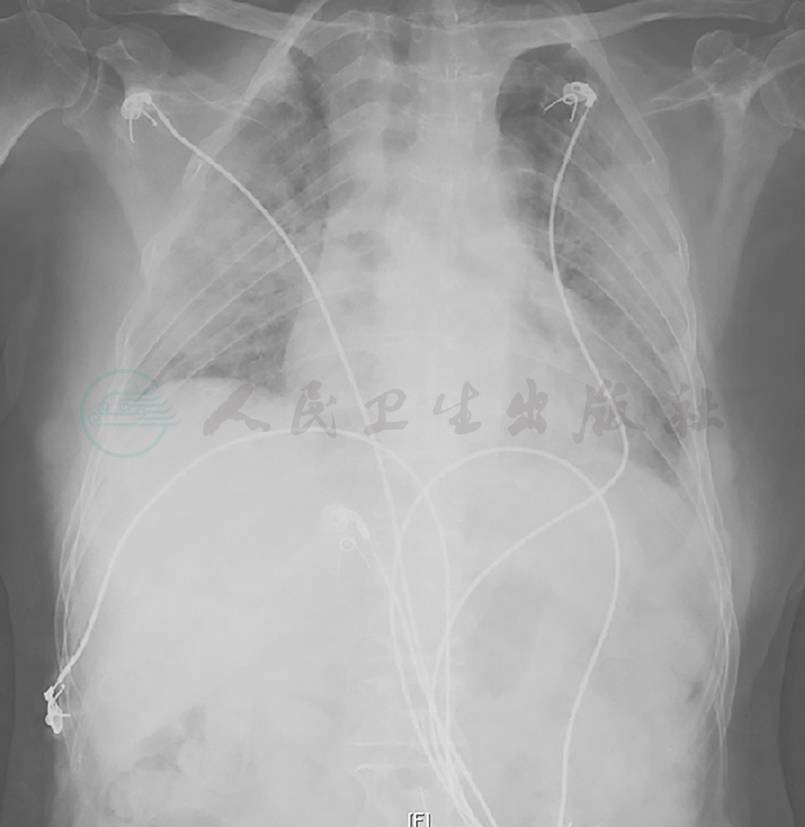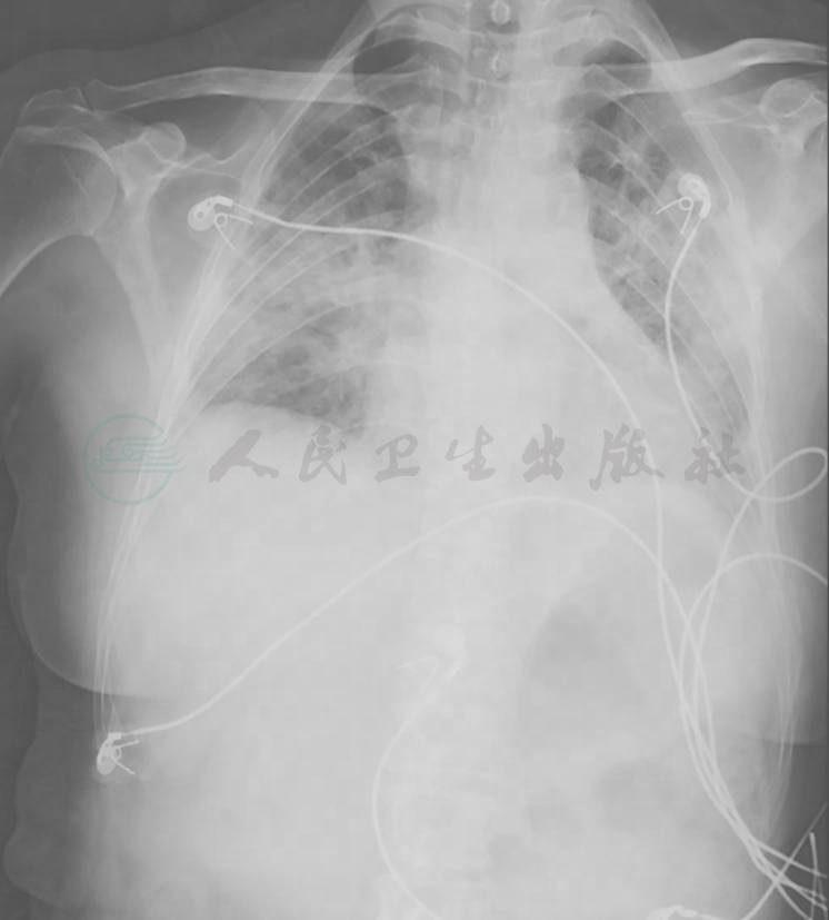 胸部X线片可见双肺多发斑片影,双侧肋膈角显示不清,变钝
