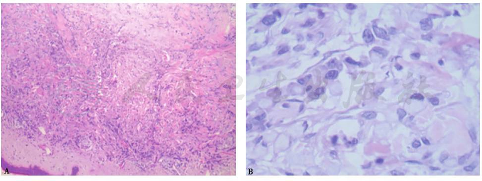 真皮内散在异型细胞,可见胞质内黏液(图7A);免疫组化染色:CK、EMA、Ki-67(50%)、p53阳性,CD68、Vimentin、Melan-A阴性;特殊染色:AB-PAS阳性(图7B)。病理表现符合印戒细胞癌转移表现,来源于胃癌等相关脏器肿瘤可能性大。