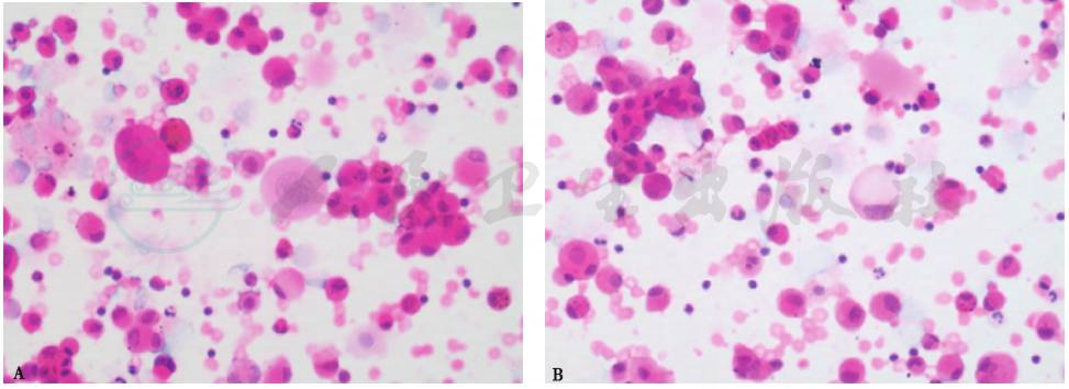 图10 支气管肺泡灌洗液病理表现(瑞氏染色,400×)