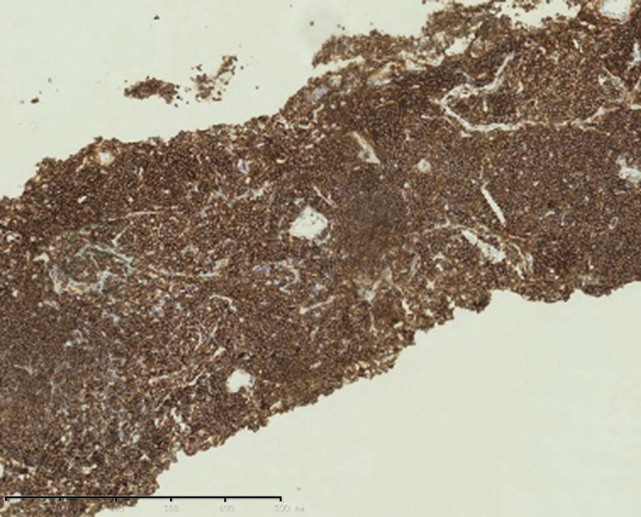左上肺经皮肺穿刺活检:病理结果符合MALT淋巴瘤(图4),免疫组化Bcl2阳性、CD20阳性、CD23阴性、CD3(散在)阳性、CD5(散在)阳性,Ki-67指数约10%。