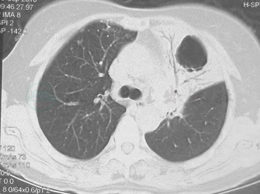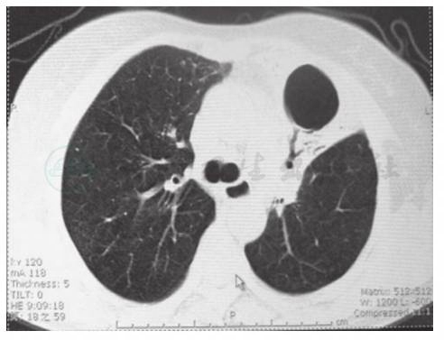 胸部CT显示,与2011年1月比较,左肺实变影较前明显吸收,但肺内囊泡影较前增大