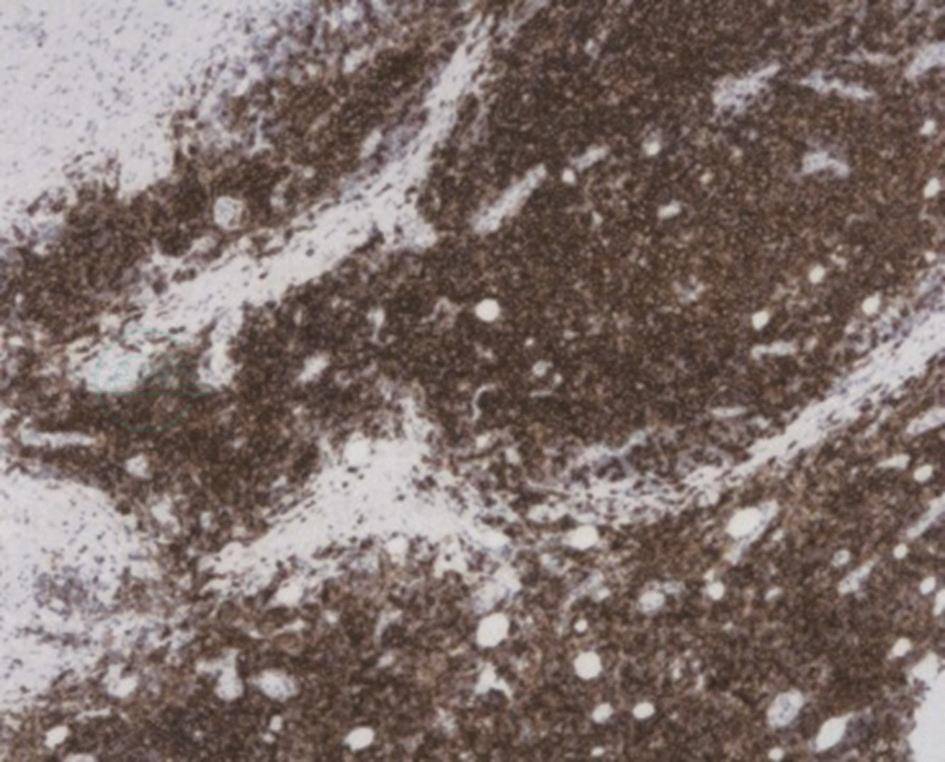 图4 经皮肺穿刺组织活检免疫组化(CD20染色,150×)