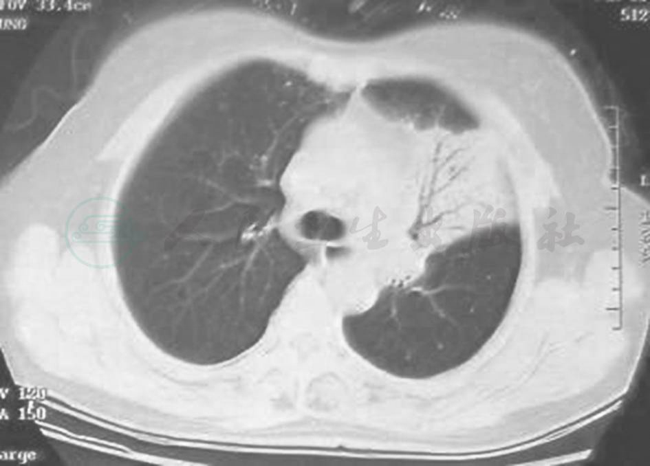 胸部CT显示,与2010年9月比较,左肺病变无明显吸收