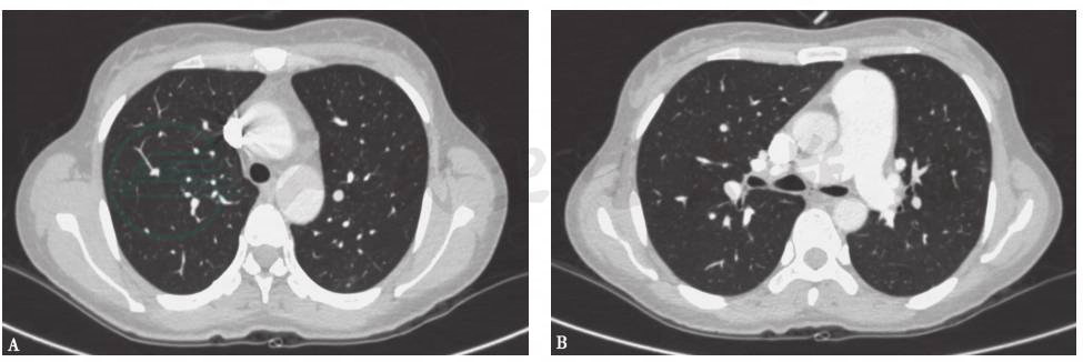女性患者,35岁,主因“间断发热5个月,阵发性胸痛伴咯血2个月余”于2015年3月16日收入院。5个多月前,患者受凉后出现寒战、发热(体温最高达39.8℃),伴头痛、流涕、大汗、乏力、肌肉酸痛,偶有咳嗽、咳白色黏痰,无喘憋、胸痛、盗汗,无腹痛、腹泻、关节疼痛,口服对乙酰氨基酚、清热解毒软胶囊,未见好转。胸部CT显示双肺散在小结节影。静脉滴注左氧氟沙星、头孢西丁、哌拉西林钠他唑巴坦钠(具体时间和先后顺序不详)后,患者症状好转。4个月前,患者再次出现发热(多于午后开始,体温最高为38℃),伴乏力、食欲缺乏,偶有咳嗽、咳白色黏痰,无寒战、盗汗、咯血症状。胸部CT显示除双肺散在小结节影外,还可见右上肺空洞。患者口服头孢类抗生素(具体不详)后,症状好转,但停药仍间断发热。2个半月前,患者出现胸骨后及左侧胸痛,呼吸时加重;胸部CT示双肺多发高密度影,伴膨胀不全、右侧胸腔积液和肺动脉增宽;超声心动图示先天性心脏病动脉导管未闭,肺动脉内径增宽,左心室扩大,二尖瓣轻-中度反流。临床按“肺炎、胸膜炎”,先后给予静脉滴注青霉素、盐酸莫西沙星和左氧氟沙星治疗,患者体温降为正常,胸痛一度缓解,但不久后胸痛再次加重,表现为胸骨后、左侧、右侧胸痛,呼吸时加重,身体取前倾屈曲位可缓解,且仍有间断发热(体温最高为38.5℃)。复查胸部CT示双肺散在斑片状高密度影减小,右肺下叶形成空洞影,胸腔积液完全吸收。患者住院进一步诊治。自发病以来,患者精神可,食欲可,大小便正常,体重无明显变化。
