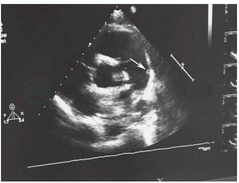 超声心动图(2015年3月24日):根据影像学检查提供的信息,再次行超声心动检查,发现动脉导管开口对侧肺动脉壁有黄豆大小赘生物,随血流漂动(图10)。