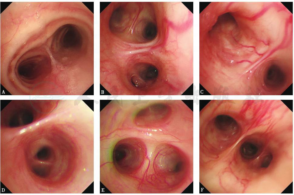 A.气管隆嵴;B.左主支气管;C.左上叶支气管;D.左下叶支气管;E.右上叶支气管;F.右中间段支气管;