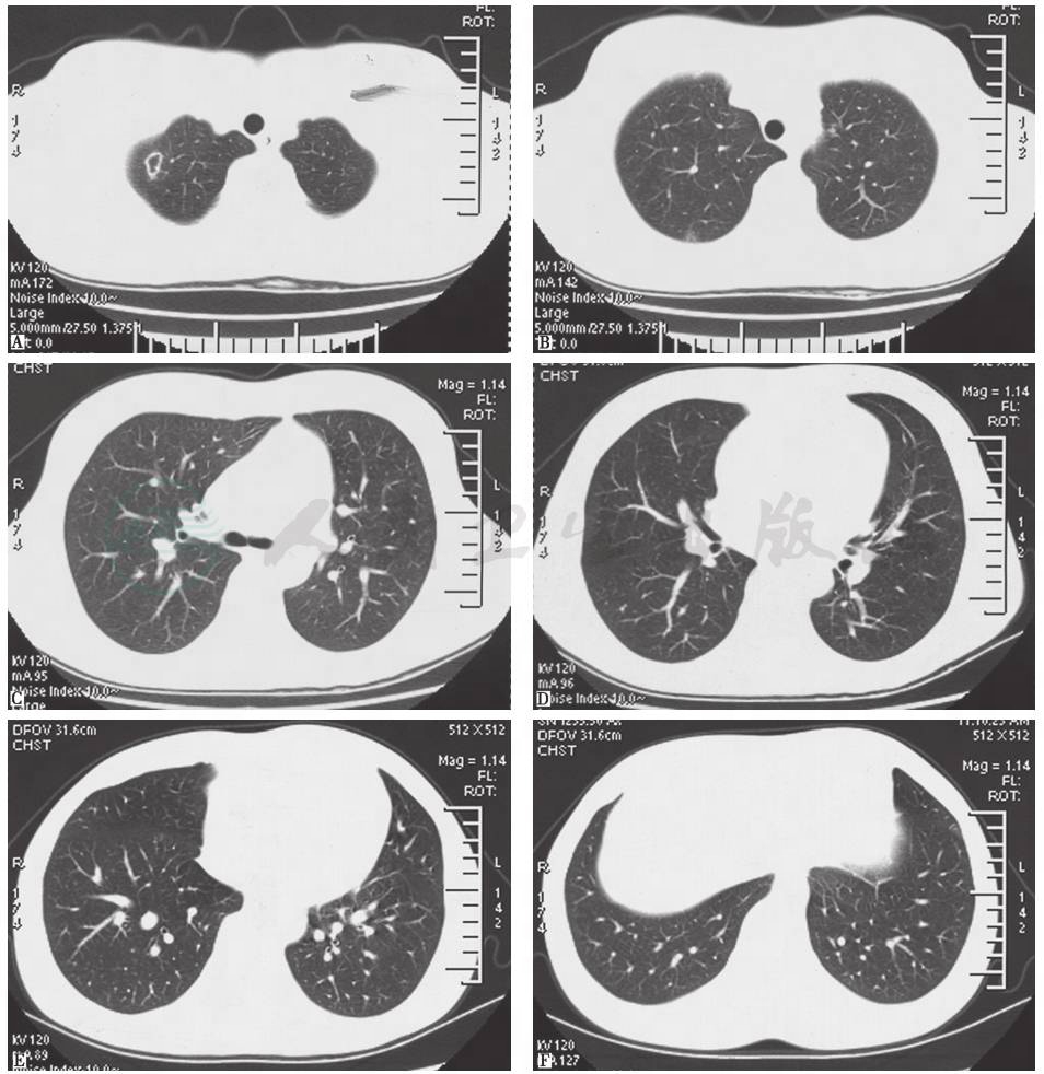 患者可出现咯血、胸痛、发热等症状,肺部影像学表现可有磨玻璃影、实变影、空洞性病变等,随时间延长而进展。本病例经抗感染治疗后,病灶有所缩小、吸收,故考虑为肺部肿瘤性病变的可能性小。