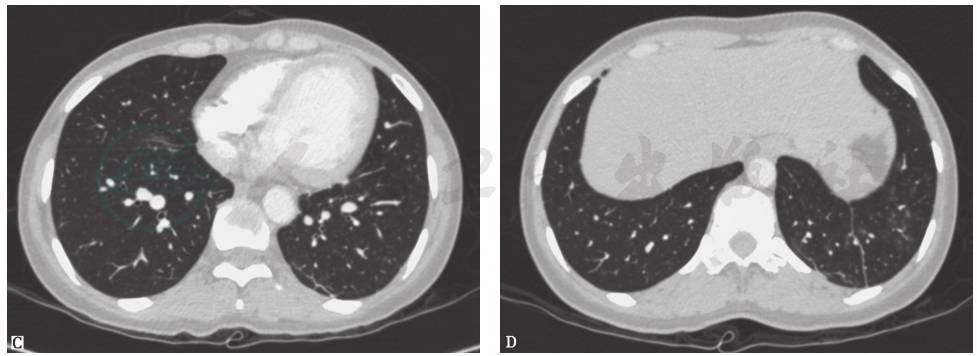 胸部CT(2015年3月1日):仅见右肺小结节影、索条影,右下肺近肋膈角处高密度楔形影,未见胸腔积液(图5)。