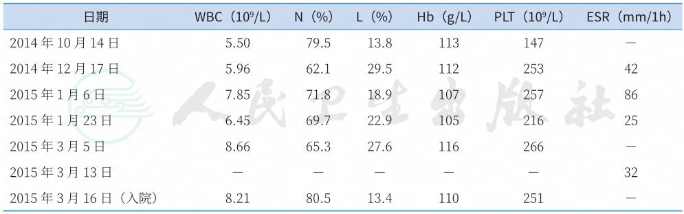 WBC:白细胞;N:中性粒细胞;L:淋巴细胞;Hb:血红蛋白;PLT:血小板;ESR:血沉