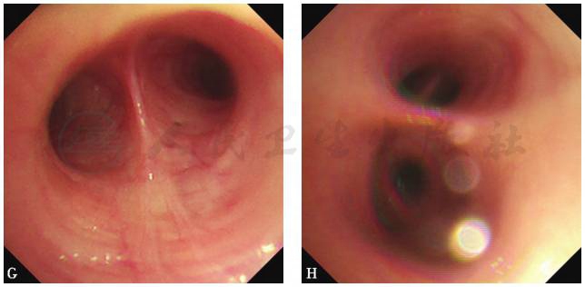 支气管镜下表现:可见部分支气管黏膜下毛细血管扩张,未见其他异常(图7)。
