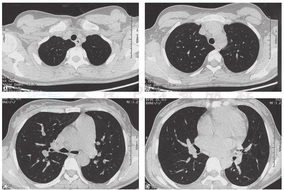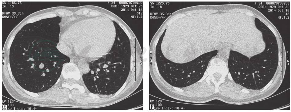 胸部CT(2014年10月16日):双肺散在小结节影,未见结节空洞改变、肺门和纵隔淋巴结肿大和胸腔积液征象(图1)。