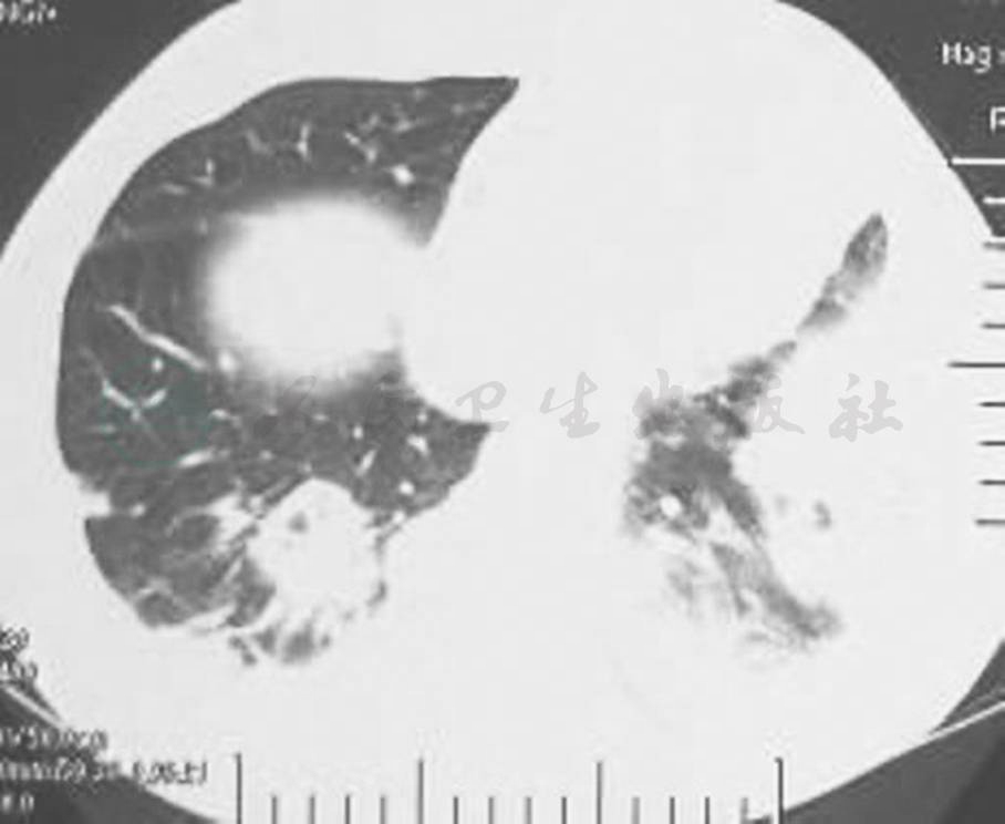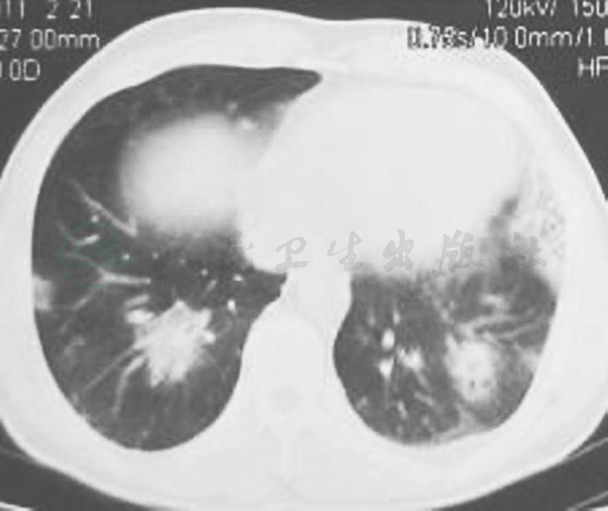 胸部CT显示双肺多发结节、空洞影,左舌叶、右下叶大片渗出影