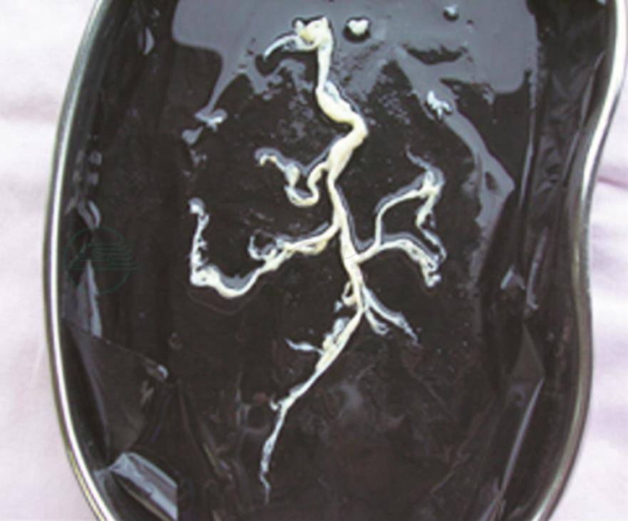 咳出物中可见按支气管分叉走行的乳白色树枝状塑型结构,长度约10cm