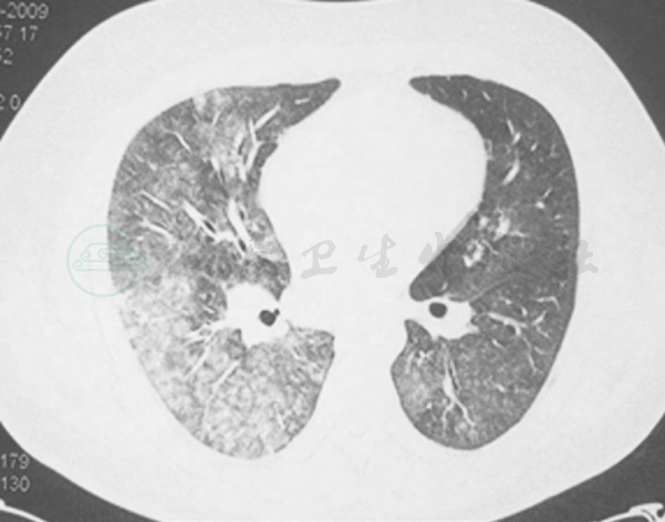 病理学特征为肺泡及细支气管腔内充满PAS染色阳性物质。影像学特点是双肺斑片状影,以肺门为中心呈蝶翼样分布,病变与正常组织分界清楚,呈地图征,斑片状高密度影内部由于小叶间隔增厚形成典型铺路石征。该病可分先天性、继发性和免疫性3类,治疗方法是全肺灌洗。本例患者病史、症状及影像学特点均不支持该病诊断。