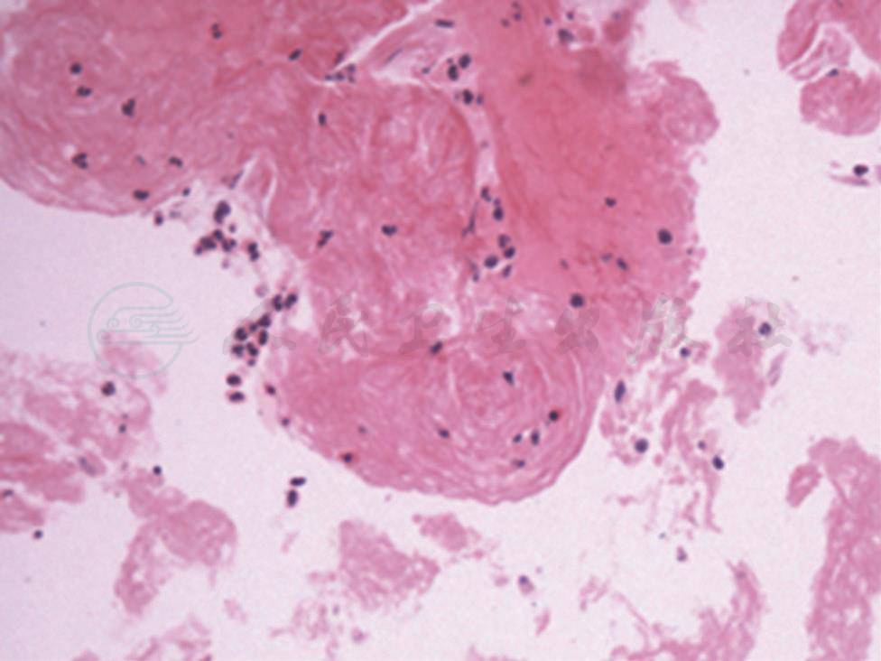 进一步询问病史得知,患者咳出痰的性状奇特——呈支气管塑型分支状。临床观察发现,患者咳嗽剧烈,痰液黏稠、不易咳出;咳出物质呈团状、白色,在清水中展开,呈树枝状、乳白色,表面光滑、有光泽,质韧、有弹性,长约15cm,起始部直径约为0.6cm,有3~4级分支(图3)。咳出物病理检查显示,大量纤维素样无结构物质中散在炎性细胞(图4)。患者每间隔2~3天咳出树枝样乳白色塑型物数次。