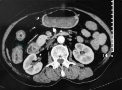 患者术后恢复比较平稳,无明显并发症,术后13d出院。具体进程为:术后第1天,床上活动,腹水淀粉酶(左158U/L,右334U/L);术后第2天,可下床活动,鼻肠管内给予葡萄糖盐水250mL滴注;术后第3天开始,下床活动时间及活动量逐步增加,肛门恢复排气,鼻肠管内滴注营养液;术后1周复查腹部CT(图12),术区无明显积液,各吻合口通畅及肠管无明显扩张,拔除引流;由于患者术后活动力及营养偏差,继续营养支持至术后第13天,各指标正常,精神状态佳,予出院。后续拟予化疗。