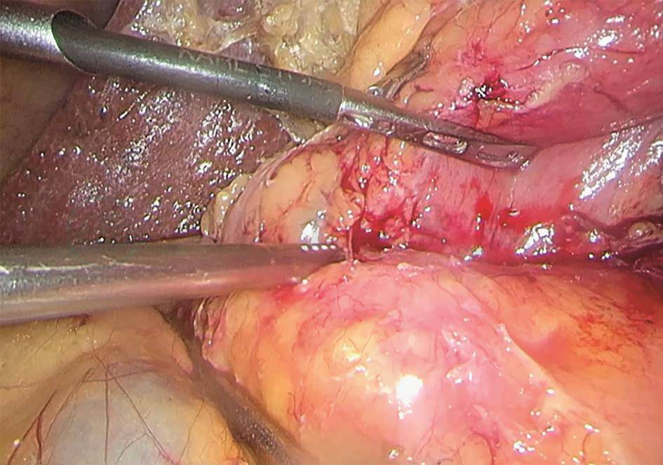 通过多学科诊疗模式(multi disciplinary team,MDT)讨论,患者诊断基本明确,为壶腹周围肿瘤伴出血及梗阻性黄疸。尽管病理未明确为恶性肿瘤,究其原因为未完全累及十二指肠乳头黏膜或取材过浅。影像学未见肿瘤转移证据,具备手术适应证。基础疾病多,全身情况差,通过相应的对症支持治疗已得到一定改善,短期内无法更加好转。在手术时机方面,存在GDA栓塞后胰周水肿的困难因素,但同样需要顾及再次出血的风险。基于上述原因,决定行腹腔镜探查+Whipple术。
