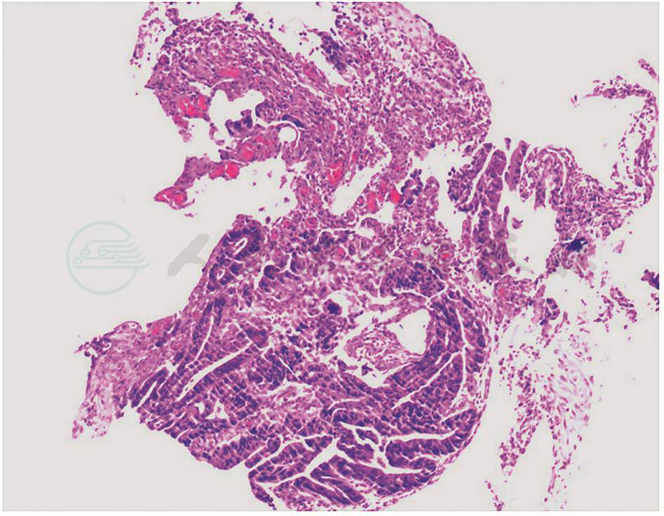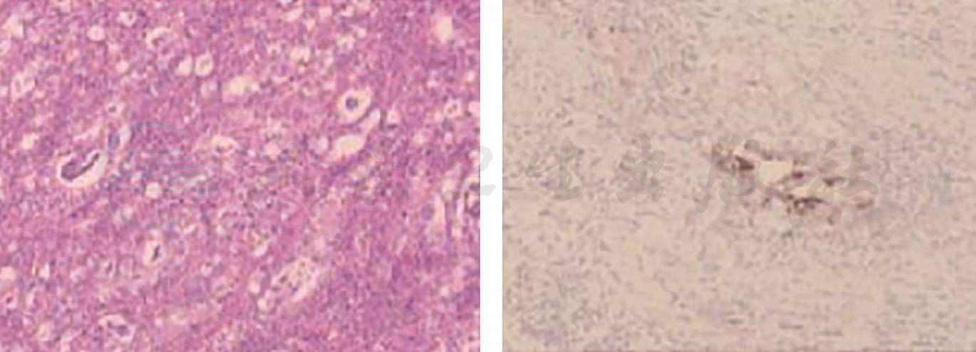 2020-03-30:行腹腔镜辅助胰十二指肠切除术(改良Blumgart胰肠吻合),术中见腹腔内无明显转移结节,胰头-十二指肠周围水肿呈硬块状,范围约8cm×8cm(图9)。切除标本后,可见:壶腹部有一1.5cm×1.5cm大小肿物,侵及胰腺及十二指肠,胆管及胰管内可见陈旧性积血(图10)。术中冰冻结果:胰腺中-低分化腺癌。常规病理结果:“壶腹部”胰胆管型中低分化腺癌,大小1.5cm×1.5cm,侵及十二指肠黏膜下层、胰腺实质(图11)。神经、脉管累犯阳性,周围组织见大片液化坏死伴肉芽组织增生。淋巴结2/18。pTNM分期T3aN1M0。免疫组化:CK7(-)、CK20(-)、CDX2(弱+)、P53(突变型)、Ki-67(约30%)。