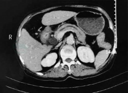 2020-03-15:当地医院腹部增强CT(图1~图3)示壶腹占位,大小约1.2cm×1.8cm,动脉期可见强化,肝内外胆管,胆总管及胰管扩张,胆总管最大内径约1.3cm,胰管最大径约0.5cm。当地医院血生化检查:白蛋白22g/L,总胆红素146μmol,直接胆红素102μmol。