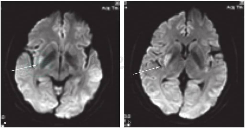 a、b.均显示右侧基底节区新发脑梗死(箭头所示)
