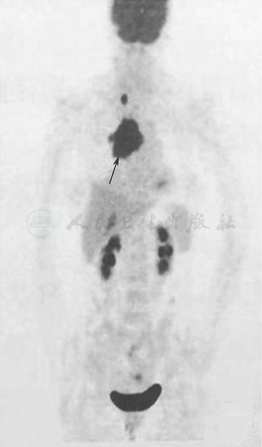显示纵隔占位性病变(箭头所示)伴淋巴结和肝脏转移