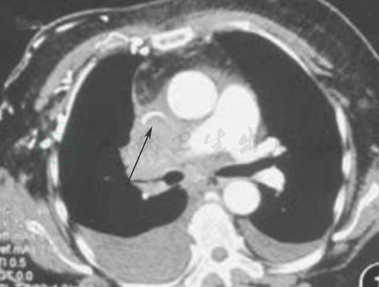 显示纵隔占位性病变压迫上腔静脉(箭头所示)