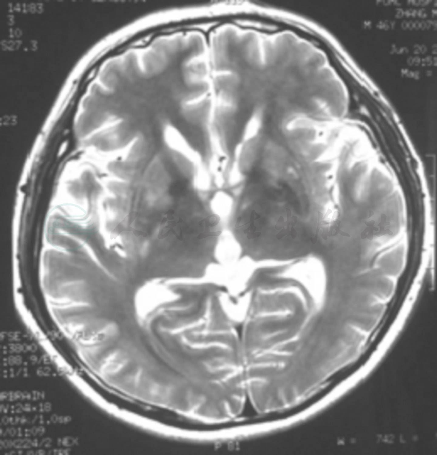 横断面T2WI显示双侧额叶皮质及皮质下、侧脑室