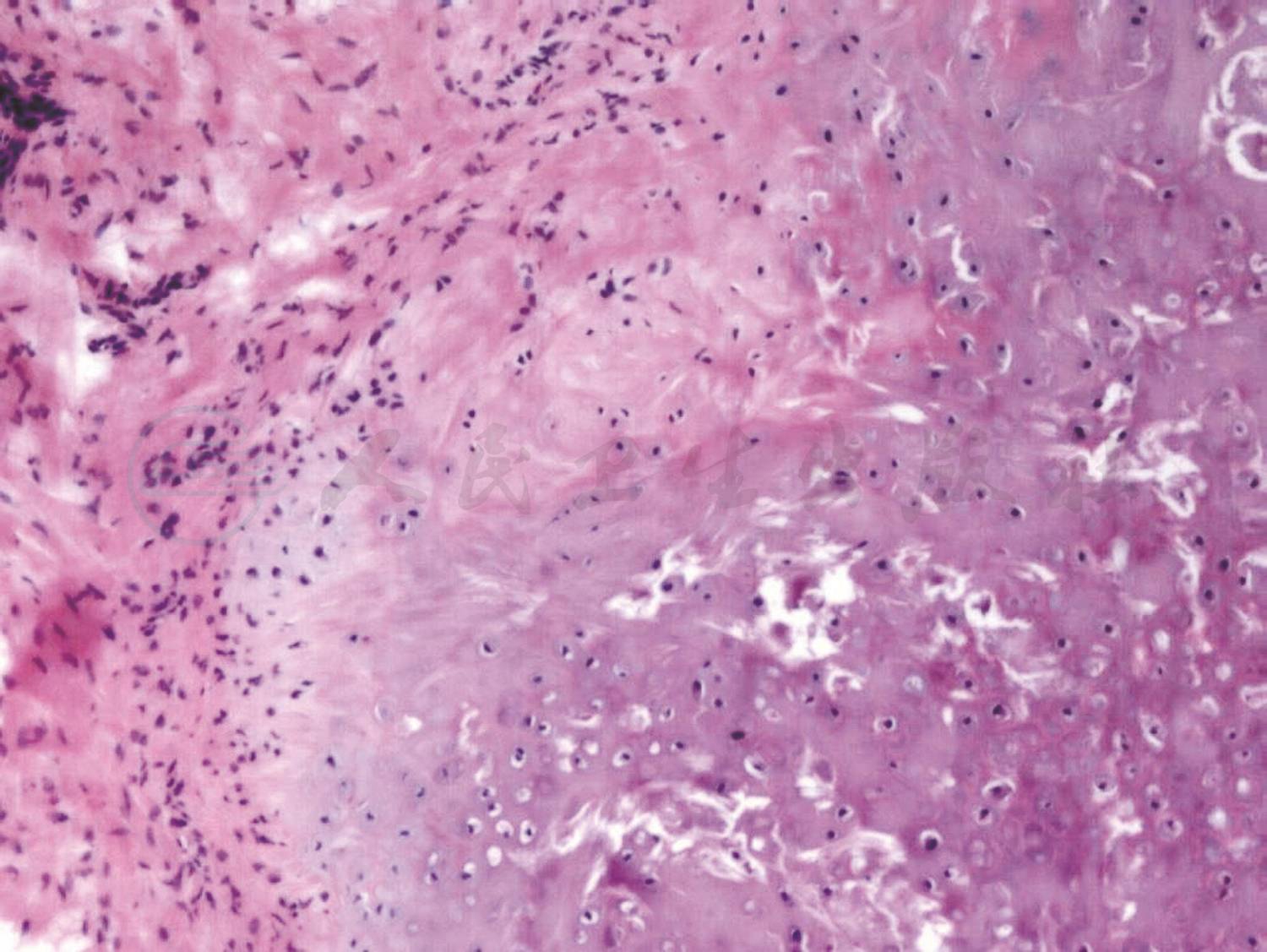 以淋巴细胞浸润为主的纤维、脂肪及软骨组织慢性炎性反应HE染色,×40
