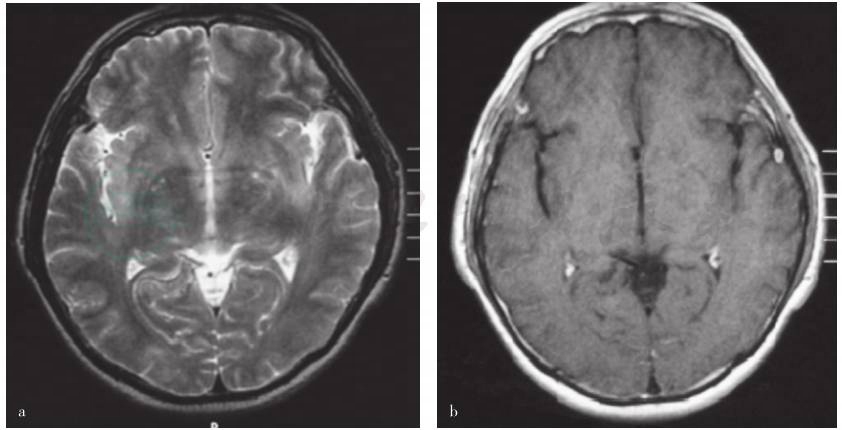 a.横断面T2WI序列可见双侧基底节区,额颞叶皮质及皮质下多发散在长T2信号,边界模糊,病灶新旧不等;b.增强扫描无强化