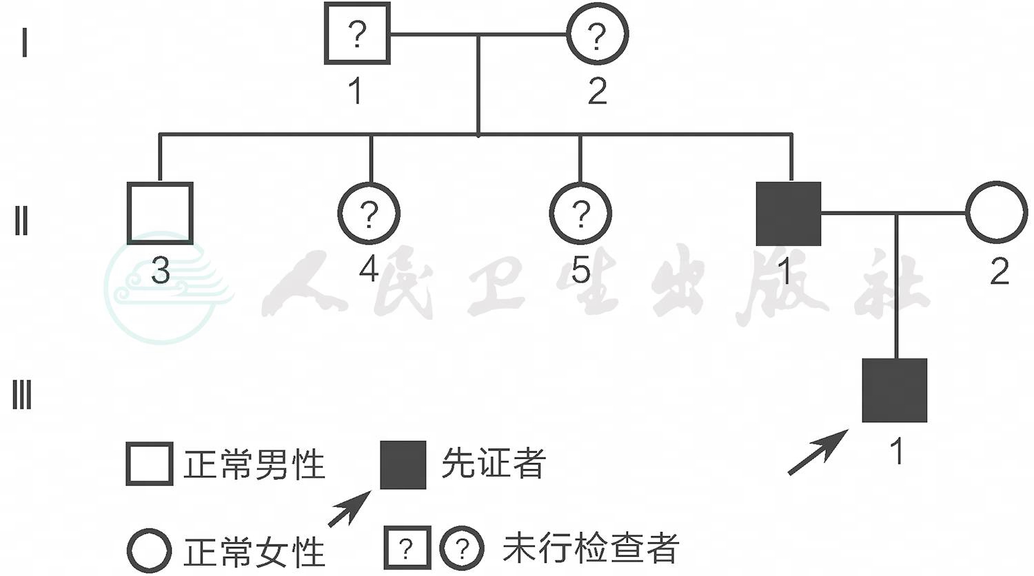 男性患儿,9岁,自觉左眼视力下降半年就诊于首都医科大学附属北京同仁医院,否认既往病史和家族史。其左眼黄斑区脂褐质物质沉积呈假性积脓样改变,右眼大致正常,即对其家系中Ⅱ:1、Ⅱ:2、Ⅱ:3及先证者共计4人8只眼进行眼科检查(图1)。