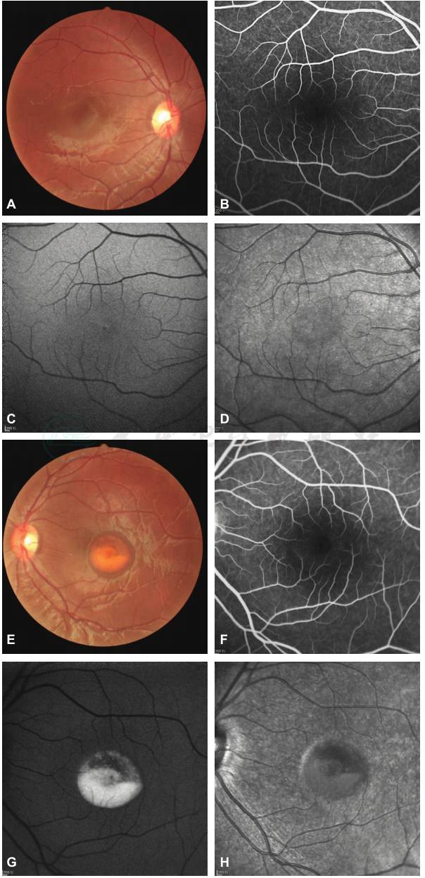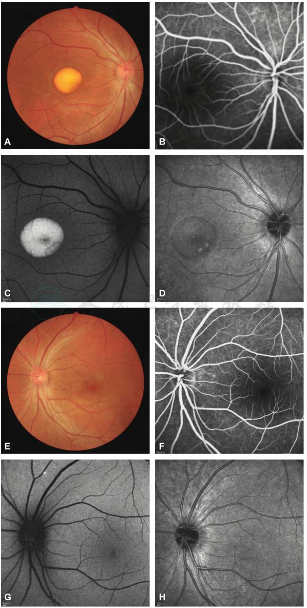 右眼未见异常(A~D);左眼黄斑区卵黄样部分吸收后的假性积脓样改变(E),红外线眼底照相呈略强荧光(F),病变区因黄斑区异常脂褐质堆积呈高自发荧光(G),荧光素眼底血管造影未见异常(H)。