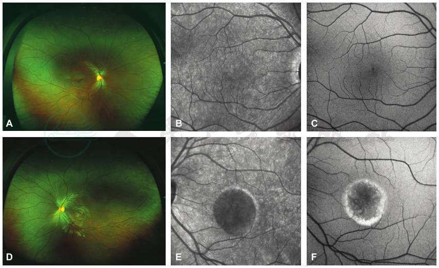 右眼未见异常(A~C);左眼视力已下降至0.2,左眼眼底卵黄样病灶破溃弥散(D),红外线眼底照相病变区不均匀荧光(E),眼底自发荧光照相病变呈高自发荧光(F)。
