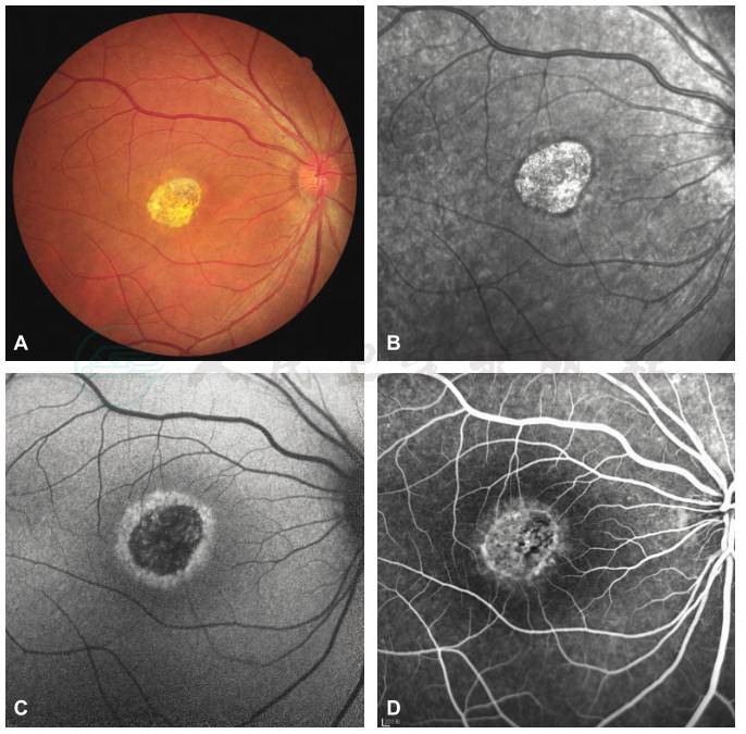 右眼黄斑区病灶瘢痕化(A),红外线眼底照相病变区强荧光(B),病变处因脱色素呈低自发荧光(C);FFA:病变区不规则强弱荧光(D)