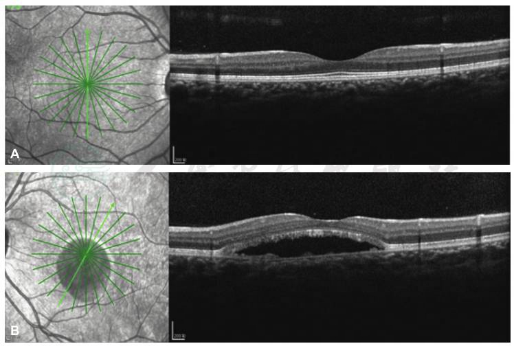 右眼未见异常(A),左眼黄斑区局限性视网膜脱离(B)。