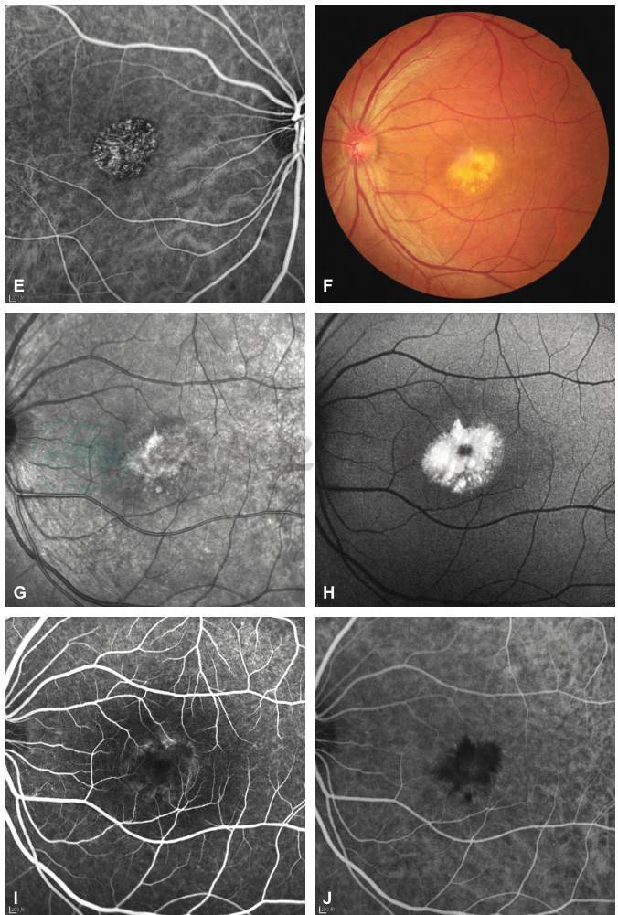 ICGA:右眼病灶处透见脉络膜(E)。左眼黄斑区出现卵黄样病灶并呈破溃期改变(F),红外线眼底照相病变区高荧光(G),眼底自发荧光照相病变呈高自发荧光(H),FFA:病变区因沉积物遮挡呈略弱荧光(I),ICGA:病灶处低荧光(J)