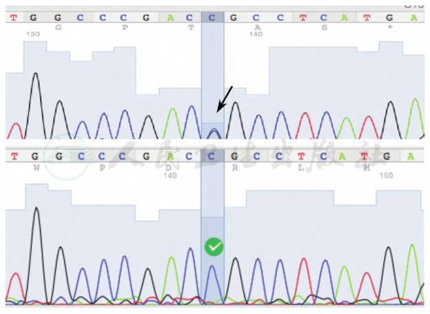 基因检测结果显示该父子BEST-1基因外显子4的第401位碱基发生错义突变(c.401C>G)(图10),导致编码精氨酸的密码子编码甘氨酸(p.Arg105Gly),其余家族成员及50名正常对照者均未检测出该突变。