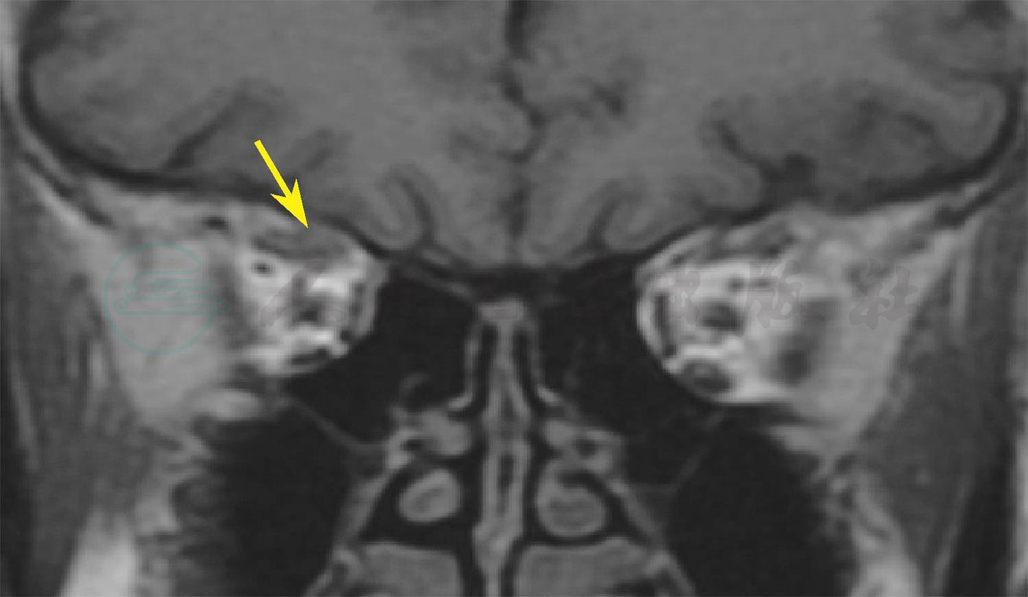 黄箭头所示位置为上直肌近总腱环处肌腹增厚。