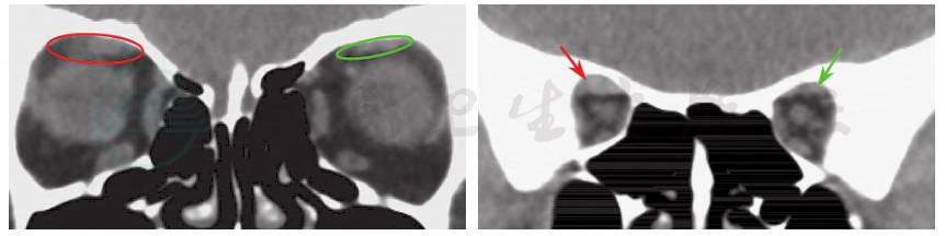 环形标记及箭头所示为两侧上直肌肌腹、肌肉周围间隙对比。