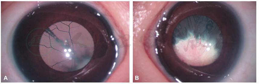 A.右眼晶状体后囊局限性混浊,可见“爪”样残存血管组织,向后与玻璃体腔纤维条索相连;B.左眼晶状体皮质混浊,晶状体后囊后可见大片致密纤维血管膜,血管丰富。