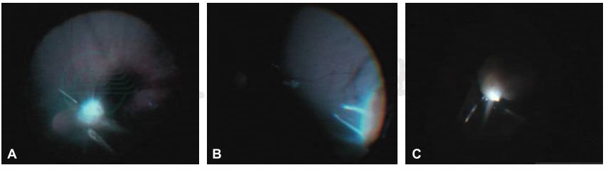 A.玻璃体纤维血管条索与视盘相连,黄斑受累,其中,视盘前牵拉性视网膜脱离;B.巩膜顶压下可见周边视网膜孤立存在的多条玻璃体纤细条索;C.左眼玻璃体腔的纤维血管条索更为粗大,其内血管丰富,向后与视盘相连,黄斑受累,视盘前的牵拉性视网膜脱离。
