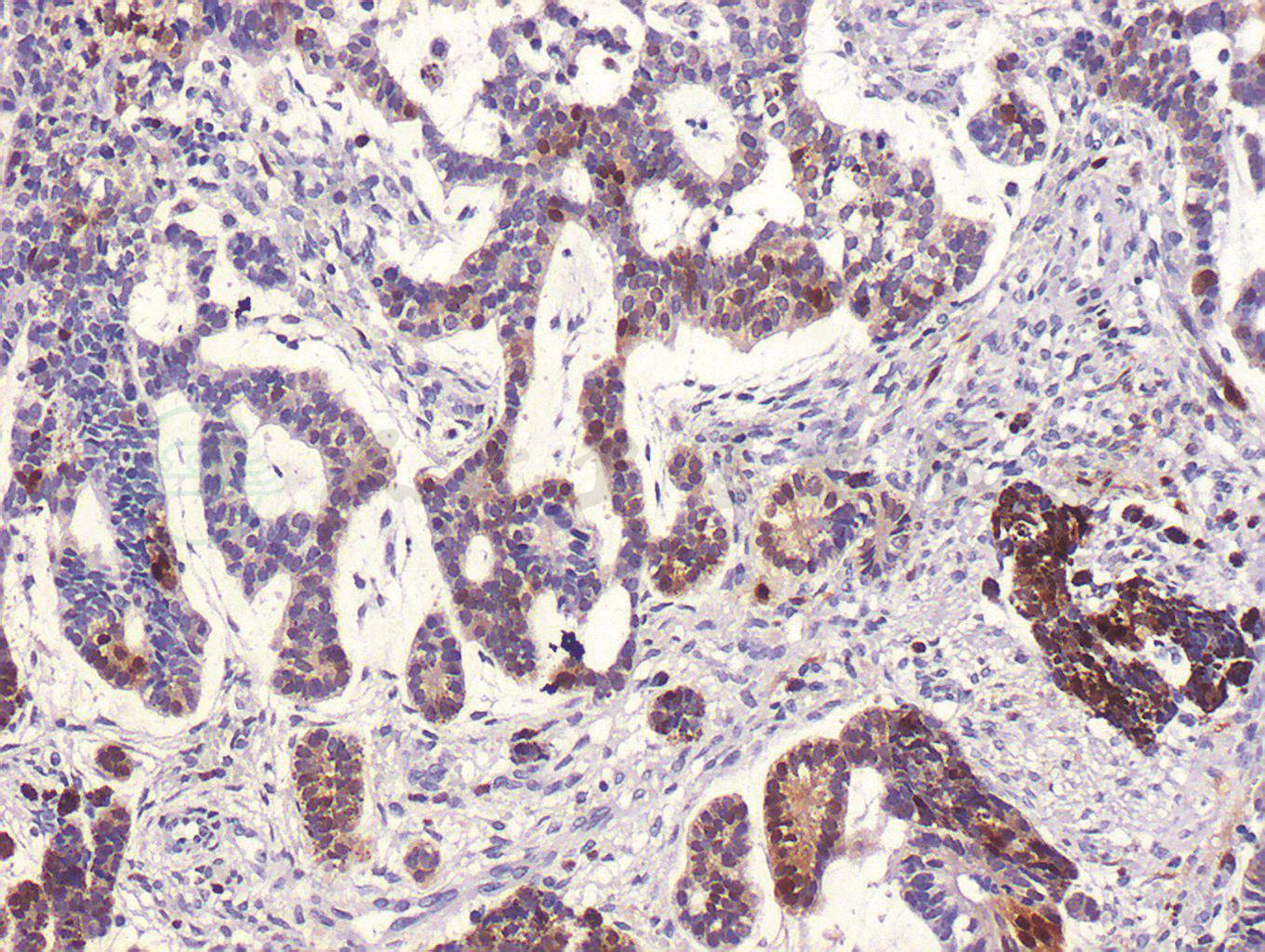 图4 左眼畸胎瘤样髓上皮瘤免疫组织化学染色S-100阳性(DAB,100×)