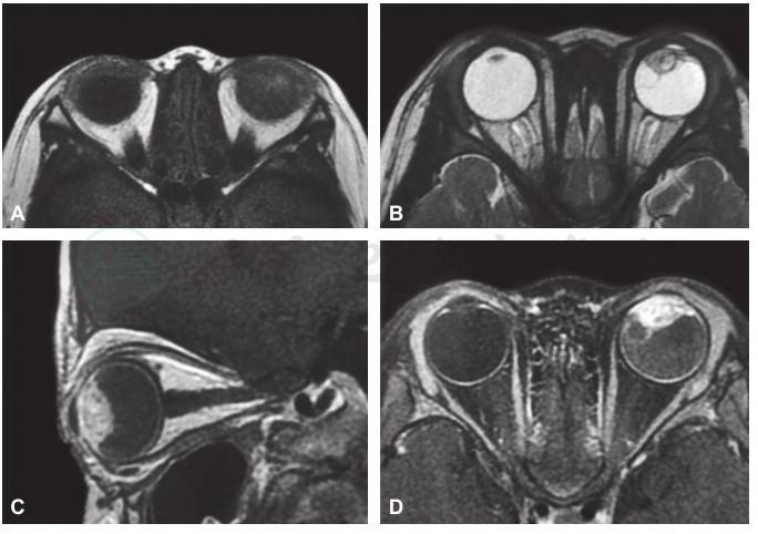 A.T1水平位,B.T2水平位,C.T1矢状位,D.增强水平位,显示左眼虹膜睫状体区可见实性占位性病变,增强扫描后可见肿瘤明显增强。