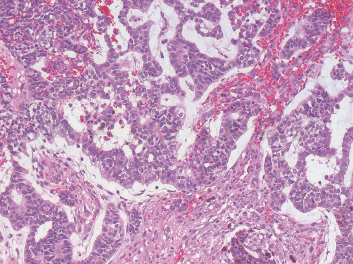 2.5岁男童因左眼外伤1个月,曾就诊于当地医院,诊断为左眼前房积血,行眼部B型超声和眼眶CT检查后发现左眼球内占位性病变,提示视网膜母细胞瘤可能性大,建议转我院就诊。我院眼科检查显示:左眼混合充血,角膜水肿混浊,前房积血,眼内窥不清,左眼外斜视。经综合评估后,建议患儿行左眼球摘除术联合一期义眼台植入术,术后行病理组织学检查最终结果显示为左眼畸胎瘤样髓上皮瘤。患儿密切随访至今,病情稳定。
