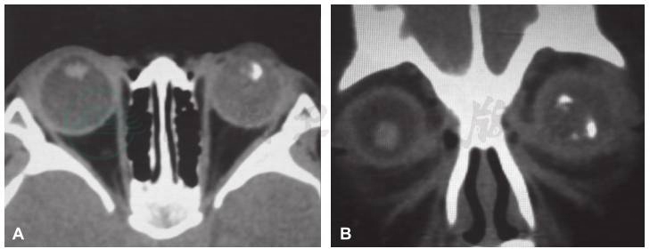 A.水平位,B.冠状位,显示左眼内肿物位于眼球前部,肿物内可见高密度钙化影。