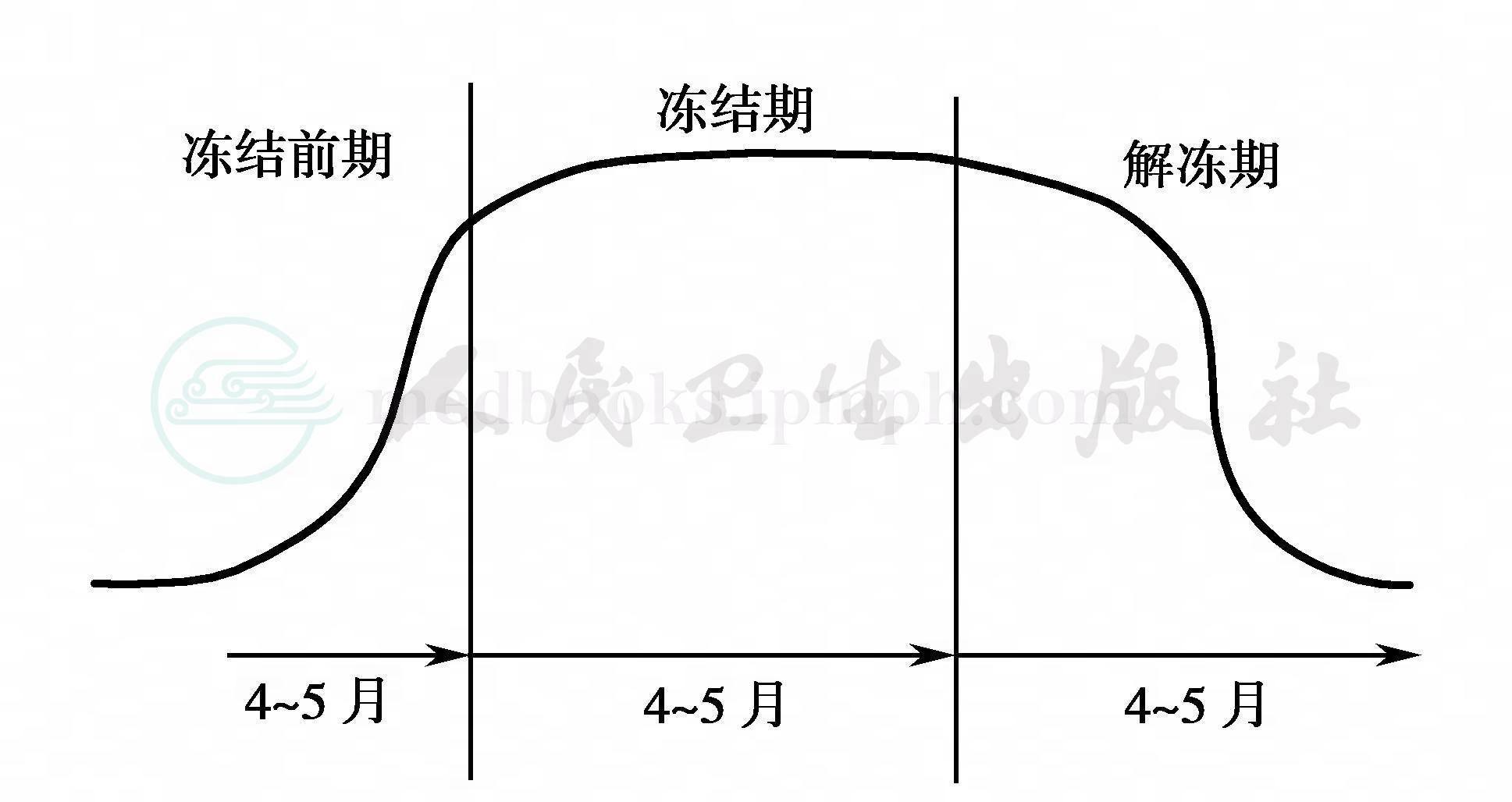 epalma于1983年将本病的病理过程分为三期:第1期或称冻结进行期(freezing phase):关节囊本身粘连,其下部皱襞因互相粘连而消失,使肩外展受限,肱二头肌长头腱腱鞘亦有粘连而滑动困难,肩痛渐重;第2期冻结期或粘连期(frozen phase):关节囊及其周围结构如冈上肌、冈下肌、肩胛下肌痛、喙肱韧带挛缩,滑膜充血肿胀,失去弹性,关节几乎冻结,不能活动,痛持续;第3期缓解期或称功能恢复期(rehabilitation phase),约经半年至1年~1.5年时间(图1),炎症逐渐吸收,疼痛缓解,肩关节活动亦渐恢复,但往往活动范围不如病前。