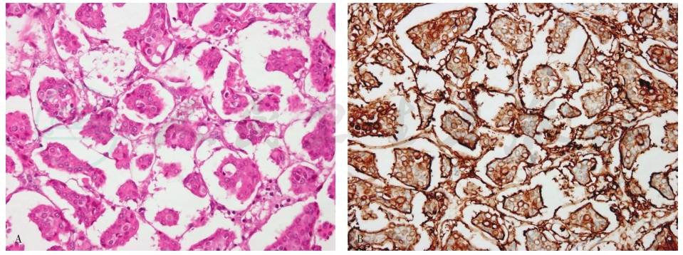 A.肿瘤具有推挤性边缘;B.肿瘤细胞由合体样细胞组成。