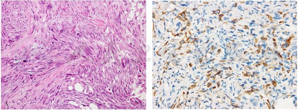 A.肿瘤细胞呈梭形组织学形态;B.免疫组化示肿瘤细胞MNF116(+)。