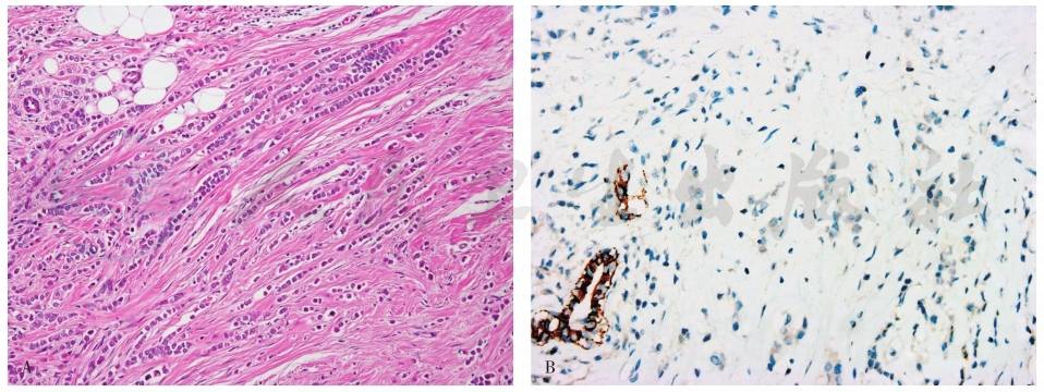 A.浸润性小叶癌(经典型);B.免疫组化示浸润性小叶癌E-cadherin(-),周围乳腺导管E-cadherin(+)。