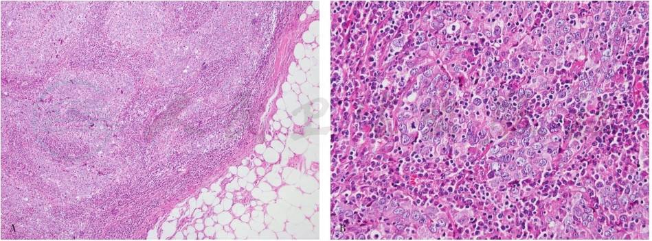 是浸润性乳腺癌中第二常见的类型,占所有浸润性癌的5%~15%。常表现为同侧多灶性或双侧发生的病变。ILC患者临床可触及团块,但更多的时候也是在乳房X线摄影或超声检查时发现。ILC与IDC-NST的临床特征具有差异:前者较少发生实质脏器(肺、肝和脑)转移,更易转移至卵巢、腹膜、胃肠道及骨等,部分转移癌在腋窝淋巴结转移中常见孤立肿瘤细胞模式(不同于肿瘤细胞簇状侵及被膜下淋巴窦)。故发生在卵巢的以印戒细胞形态为主的转移性癌,除考虑胃肠来源的印戒细胞癌外,还需鉴别诊断乳腺来源ILC。
